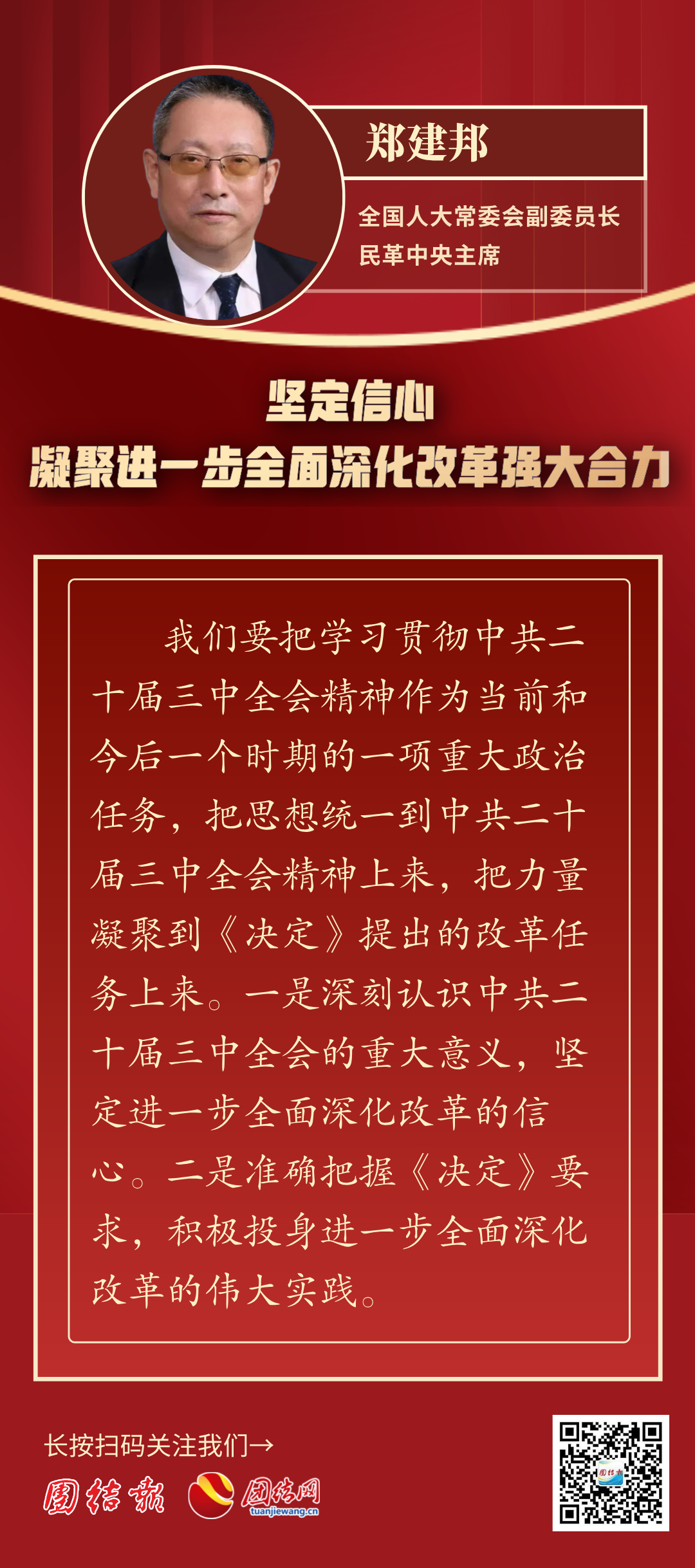 7月25日,民革中央理論學(xué)習(xí)中心組召開專題座談會,以學(xué)習(xí)貫徹中共二十屆三中全會精神為主題進行本年度第四次集體學(xué)習(xí)。全國人大常委會副委員長、民革中央主席鄭建邦主持會議并講話。