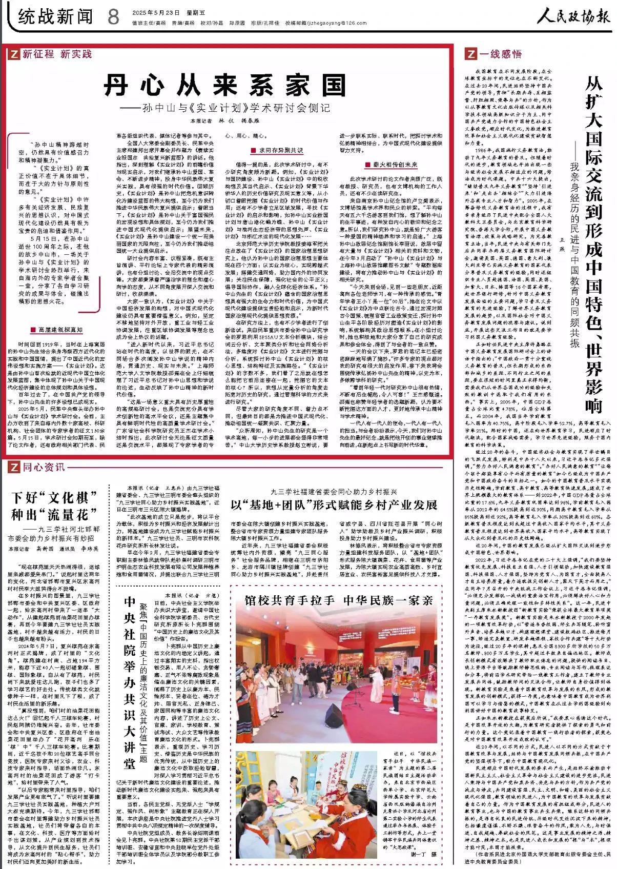 由民革中央牽頭主辦的孫中山與《實(shí)業(yè)計(jì)劃》學(xué)術(shù)研討會(huì)5月15日在廣東中山開幕。全國人大常委會(huì)副委員長、民革中央主席鄭建邦在開幕會(huì)上講話表示,深刻理解《實(shí)業(yè)計(jì)劃》的前瞻價(jià)值與現(xiàn)實(shí)啟示,對(duì)繼承孫中山愛國、革命、不斷進(jìn)步精神,投身中華民族偉大復(fù)興實(shí)踐,具有很強(qiáng)的時(shí)代價(jià)值。中華兒女要以寬闊的政治胸襟和高度的歷史自覺,不斷深化兩岸同胞的歷史記憶和文化認(rèn)同,以中山精神為紐帶,共同追求國家完全統(tǒng)一的美好未來。[詳情]