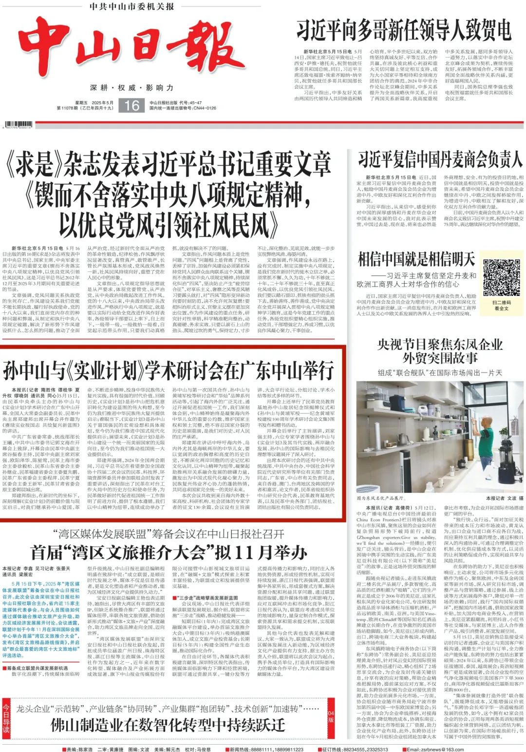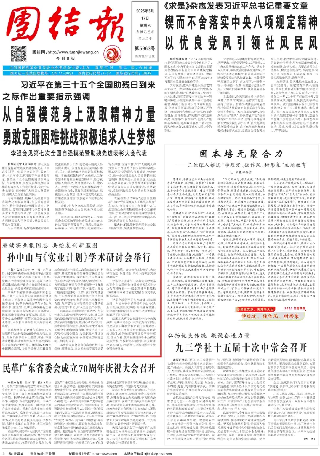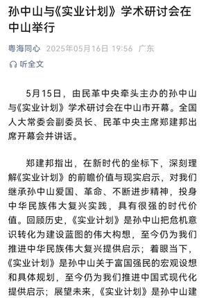 由民革中央牽頭主辦的孫中山與《實(shí)業(yè)計(jì)劃》學(xué)術(shù)研討會(huì)5月15日在廣東中山開幕。全國人大常委會(huì)副委員長、民革中央主席鄭建邦出席開幕會(huì)并講話。鄭建邦呼吁海峽兩岸中華兒女不斷深化歷史記憶和文化認(rèn)同,以中山精神為紐帶,凝聚起推動(dòng)兩岸關(guān)系融合發(fā)展的磅礴力量,為強(qiáng)國建設(shè)、民族復(fù)興偉業(yè)凝心聚力,共同追求國家完全統(tǒng)一的美好未來。[詳情]