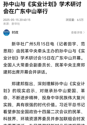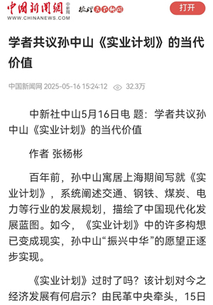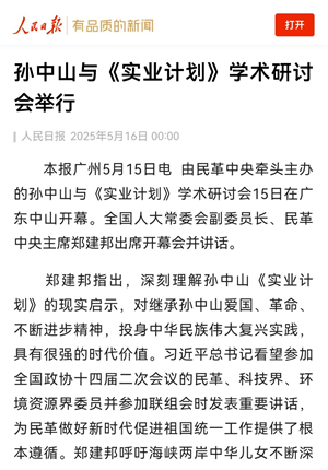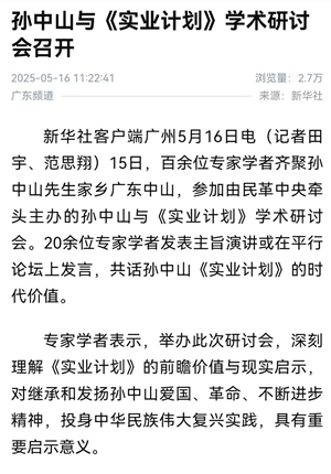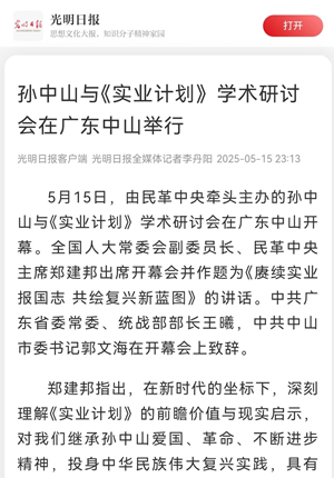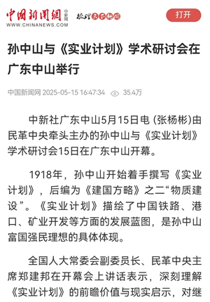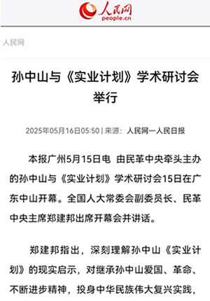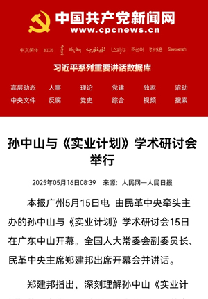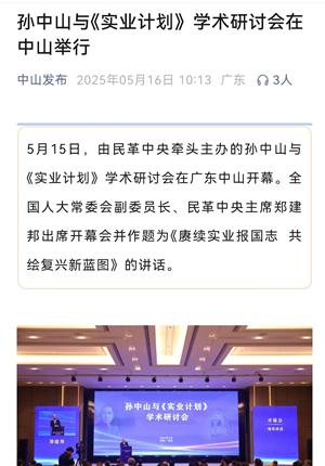 5月15日,百余位專家學(xué)者齊聚孫中山先生家鄉(xiāng)廣東中山,參加由民革中央牽頭主辦的孫中山與《實(shí)業(yè)計(jì)劃》學(xué)術(shù)研討會(huì)。20余位專家學(xué)者發(fā)表主旨演講或在平行論壇上發(fā)言,共話孫中山《實(shí)業(yè)計(jì)劃》的時(shí)代價(jià)值。專家學(xué)者表示,舉辦此次研討會(huì),深刻理解《實(shí)業(yè)計(jì)劃》的前瞻價(jià)值與現(xiàn)實(shí)啟示,對(duì)繼承和發(fā)揚(yáng)孫中山愛國、革命、不斷進(jìn)步精神,投身中華民族偉大復(fù)興實(shí)踐,具有重要啟示意義。[詳情]