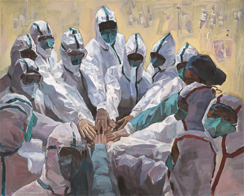 我覺得作為美術(shù)工作者,在這個時刻必須拿起手中的畫筆,義不容辭地投入抗疫工作。我在收集的大量圖文資料基礎(chǔ)上,構(gòu)圖了一群白衣戰(zhàn)士每天工作之初的一個典型場景,不僅是表達(dá)對這群奮戰(zhàn)一線的最可愛的人的敬意,也是想表現(xiàn)在抗疫中呈現(xiàn)出的萬眾一心的強大精神風(fēng)貌!