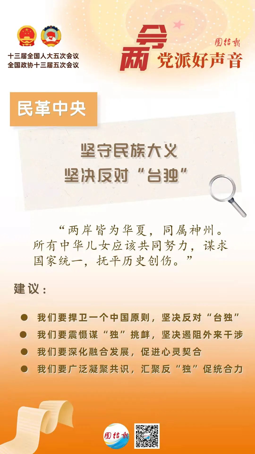 ——我們要廣泛凝聚共識(shí),匯聚反“獨(dú)”促統(tǒng)合力。祖國(guó)完全統(tǒng)一,是全體華夏兒女的共同心愿。強(qiáng)國(guó)有我、統(tǒng)一有我,是包括兩岸同胞在內(nèi)的全體中華兒女的共同責(zé)任。海內(nèi)外中華兒女要堅(jiān)定信心、不懈努力,共擔(dān)民族大義,匯聚起實(shí)現(xiàn)祖國(guó)統(tǒng)一、民族復(fù)興的磅礴偉力。