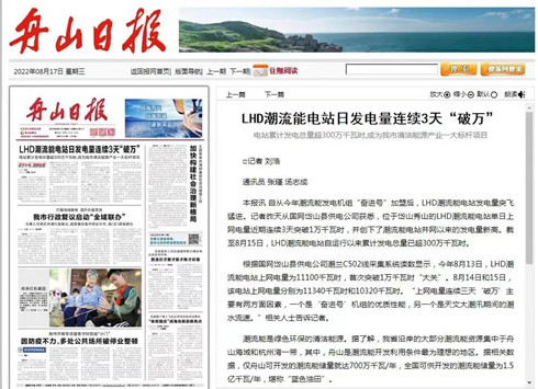 LHD 潮流能電站發(fā)電量突飛猛進(jìn)!位于舟山的 LHD 潮流能電站單日上網(wǎng)電量近期連續(xù)3天突破1萬千瓦時(shí),并創(chuàng)下了潮流能電站并網(wǎng)以來的發(fā)電量新高。截至8月15日,LHD 潮流能電站自運(yùn)行以來累計(jì)發(fā)電總量已超300萬千瓦時(shí)。LHD海洋潮流能發(fā)電項(xiàng)目由浙江民革黨員林東擔(dān)任總工程師,帶領(lǐng)研究團(tuán)隊(duì)歷經(jīng)十年成功研發(fā)。