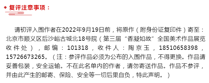 9月6日,由民革中央、中國美術(shù)家協(xié)會(huì)、中國美術(shù)館共同主辦的“第三屆‘香凝如故’全國美術(shù)作品展覽”(暫定名)初評(píng)工作會(huì)在京舉行。中國美術(shù)家協(xié)會(huì)組織專家完成了此次初評(píng)工作。當(dāng)日,中國美術(shù)家協(xié)會(huì)官網(wǎng)公布第三屆“香凝如故”全國美術(shù)作品展覽初評(píng)結(jié)果及復(fù)評(píng)注意事項(xiàng)。