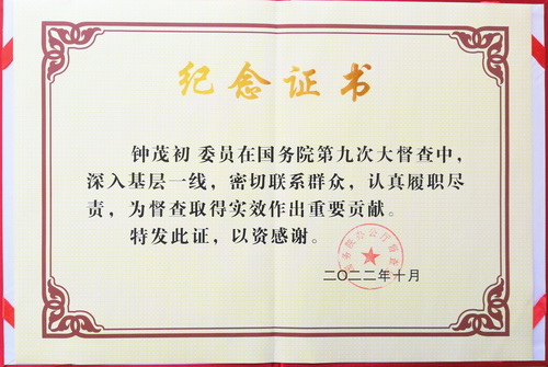 國務院辦公廳督查室在感謝信中表示,鐘茂初在督察期間,既深入基層一線明察暗訪、深督細查、督幫一體,為人民群眾、市場主體和基層政府解決了一批反映強烈的堵點痛點難點問題,推動黨中央、國務院決策部署落實落地;又聚焦穩(wěn)住經(jīng)濟大盤和改革發(fā)展主要任務開展調研,結合了解的情況認真思考研究,對經(jīng)濟社會發(fā)展和政府工作提出了很多寶貴的意見和建議。工作中,鐘茂初堅持原則、實事求是、擔當作為、嚴于律己,展現(xiàn)出履職盡責的優(yōu)良作風。