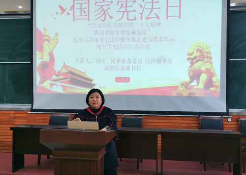 12月4日上午,法律服務(wù)組副組長(zhǎng)兼秘書長(zhǎng)周朕受民革天津市委會(huì)委托,率律師團(tuán)隊(duì)赴天津市求真高級(jí)中學(xué),以線上會(huì)議的形式作憲法日主題宣講。求真中學(xué)全體教職員工共100余人聆聽宣講。