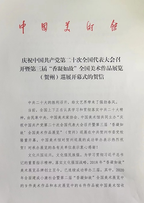 中國美術(shù)家協(xié)會、中國美術(shù)館分別為此次賀州巡展發(fā)來賀信。