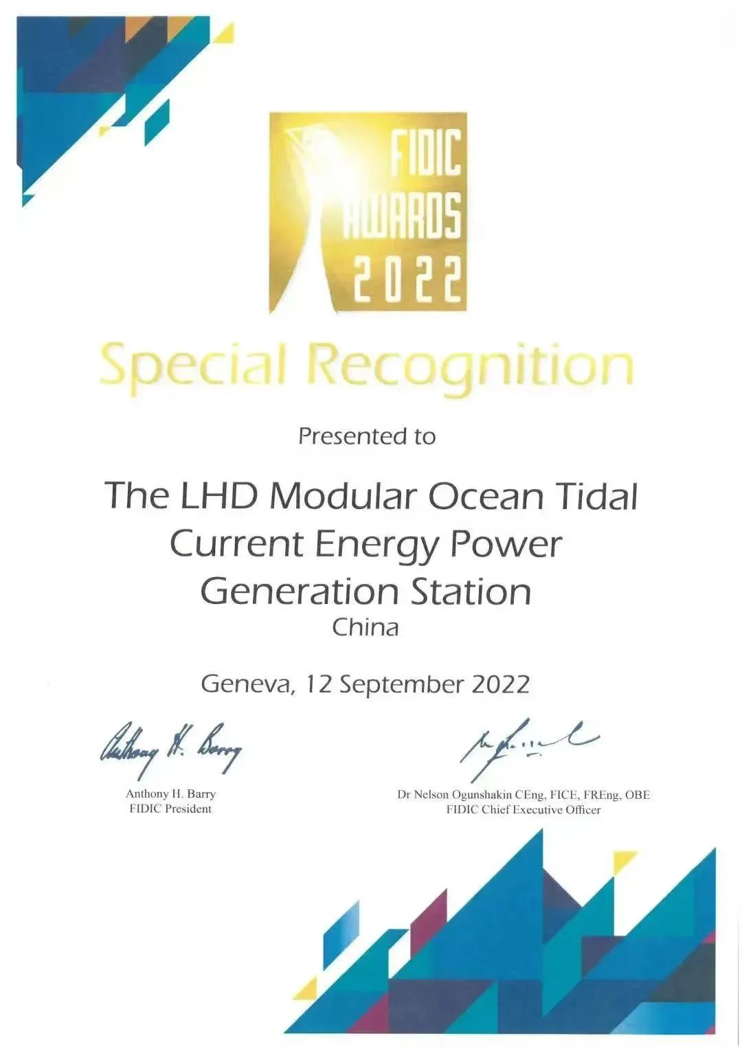 前不久, “LHD模塊化海洋潮流能發(fā)電站”項(xiàng)目入圍2022年度菲迪克工程項(xiàng)目獎(jiǎng)名單,并獲得“特別認(rèn)可獎(jiǎng)”。菲迪克工程獎(jiǎng)是國際工程咨詢領(lǐng)域的最高獎(jiǎng)項(xiàng),該獎(jiǎng)項(xiàng)每年評(píng)選一次,旨在表彰對(duì)世界經(jīng)濟(jì)社會(huì)發(fā)展具有突出作用的工程項(xiàng)目,被譽(yù)為行業(yè)內(nèi)的“諾貝爾獎(jiǎng)”。