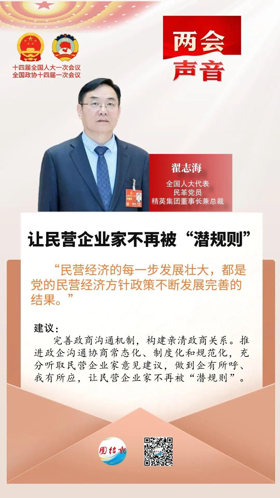 “民營(yíng)經(jīng)濟(jì)的每一步發(fā)展壯大,都是黨的民營(yíng)經(jīng)濟(jì)方針政策不斷發(fā)展完善的結(jié)果”“民營(yíng)企業(yè)發(fā)展面臨壓力的背景下,信心和信念顯得尤為重要”“單獨(dú)設(shè)立民營(yíng)企業(yè)營(yíng)商環(huán)境評(píng)價(jià)指標(biāo)體系,以更好保護(hù)民營(yíng)經(jīng)濟(jì)市場(chǎng)主體地位和積極性”“應(yīng)大力扶持民營(yíng)文化企業(yè)高質(zhì)量發(fā)展,激勵(lì)創(chuàng)作出高品位、有內(nèi)涵、重審美的文化精品,為中華文化國(guó)際傳播提供產(chǎn)品支撐”......作為全國(guó)人大代表,民革黨員翟志海關(guān)注的領(lǐng)域很廣,但如何為民營(yíng)企業(yè)發(fā)展創(chuàng)造更好條件始終是他放不下的牽掛。在今年全國(guó)兩會(huì)上,翟志海在深入調(diào)研的基礎(chǔ)上帶來(lái)了7份建議,其中一半和民營(yíng)企業(yè)發(fā)展有關(guān)。