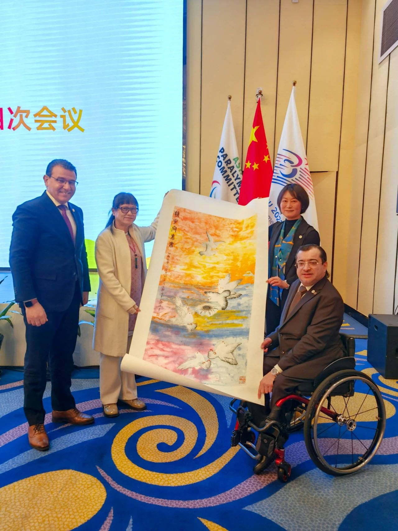 3月28日,杭州亞殘運(yùn)會協(xié)調(diào)委員會第四次會議在杭州圓滿召開。會議期間,浙江民革黨員王瀅向亞殘運(yùn)會捐獻(xiàn)了自己的畫作《攜手向未來》。亞殘奧委員會主席馬吉德·拉什德親手接過畫作,并對她表示感謝。