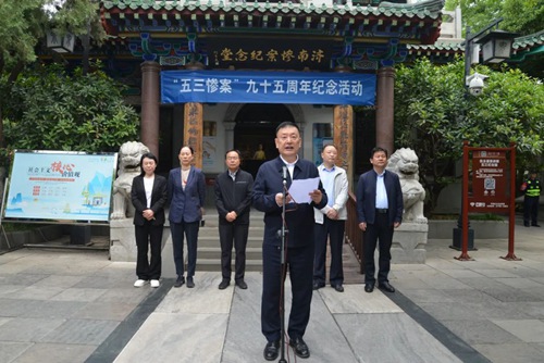 王伯芝代表民革山東省委會、民革濟南市委會,向在慘案中所有遇難的同胞表示深切哀悼,向為了中華民族不畏強敵、英勇抗爭的先烈致以崇高敬意。他指出,近年來,民革相繼開展的“五三慘案”歷史研究和思想教育活動,提出了“修建‘五三’慘案紀念碑、紀念館”、“設立5月3日市警日”等建議,受到中共山東省委、濟南市委的高度重視,為濟南市愛國主義教育工作做出了積極貢獻。他強調,全體民革黨員及入黨積極分子要以史為鑒,警鐘長鳴,奮發(fā)圖強,勇毅前行,繼承弘揚愛國主義優(yōu)良傳統(tǒng),始終堅持中國共產黨的領導,積極投身中國式現(xiàn)代化的偉大實踐,為全面推進中華民族偉大復興而團結奮斗。