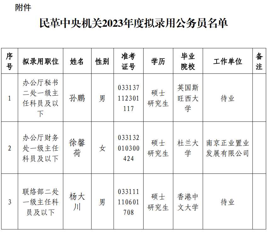 附件:民革中央機(jī)關(guān)2023年度擬錄用公務(wù)員名單