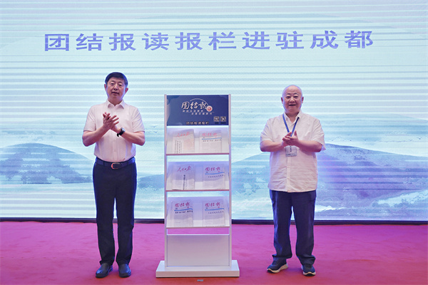 谷振春與里贊共同為團(tuán)結(jié)報讀報欄進(jìn)駐成都揭幕