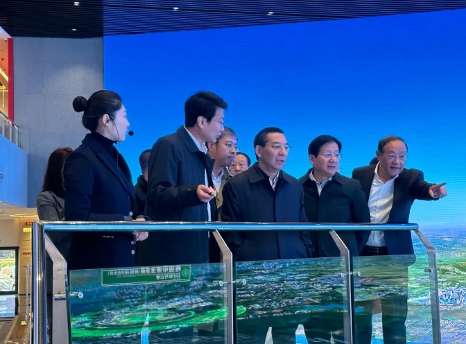 調研組一行在青島西海岸新區(qū)規(guī)劃展覽館考察。
