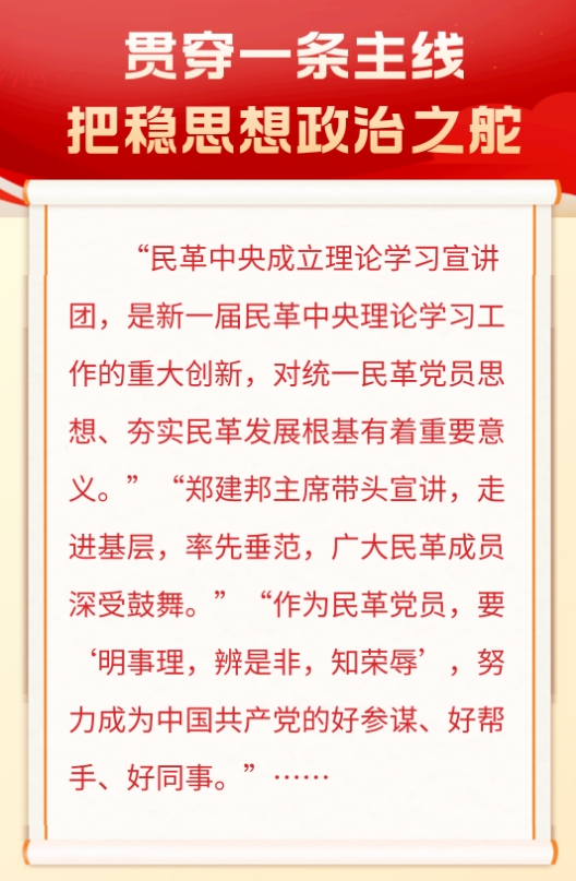 時間回溯至3月初全國政協(xié)十四屆一次會議首場記者會,鄭建邦在回答記者提問時,同樣用“把好政治方向、強化自身素質(zhì)、提升履職本領(lǐng)、樹牢規(guī)矩意識”概括新一屆民革領(lǐng)導(dǎo)班子對今后一個時期工作的規(guī)劃。一年來,這四句話被反復(fù)提及,也指引著新一屆民革中央持續(xù)求解新時代建設(shè)一個什么樣的參政黨和怎樣建設(shè)參政黨等重大命題,并用參政履職的新探索新成果不斷書寫著新的答卷。