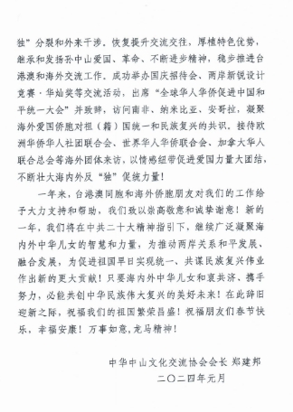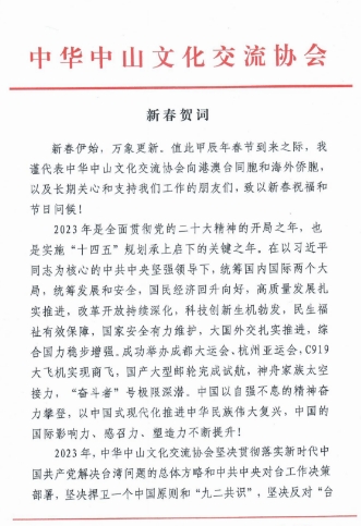 新春伊始,萬象更新。值此甲辰年春節(jié)到來之際,我謹(jǐn)代表中華中山文化交流協(xié)會(huì)向港澳臺(tái)同胞和海外僑胞,以及長期關(guān)心和支持我們工作的朋友們,致以新春祝福和節(jié)日問候!