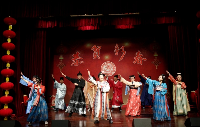 民革中央聯(lián)絡(luò)部全體同志帶來京劇《大唐貴妃》選段《長(zhǎng)生殿》《梨花頌》,并穿插熱門舞蹈“科目三”,用古老的藝術(shù)語言、現(xiàn)代的表現(xiàn)手法,講純正感人的中國(guó)故事,再次引爆全場(chǎng)氣氛。