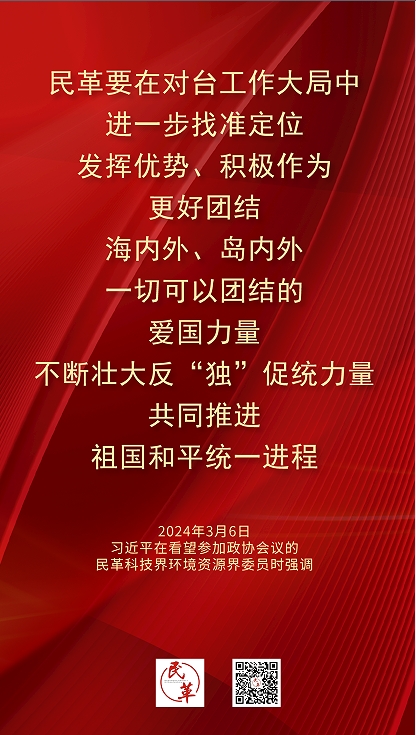 習(xí)近平強(qiáng)調(diào),民革要在對臺工作大局中進(jìn)一步找準(zhǔn)定位、發(fā)揮優(yōu)勢、積極作為,更好團(tuán)結(jié)海內(nèi)外、島內(nèi)外一切可以團(tuán)結(jié)的愛國力量,不斷壯大反“獨(dú)”促統(tǒng)力量,共同推進(jìn)祖國和平統(tǒng)一進(jìn)程。要積極推動兩岸科技、農(nóng)業(yè)、人文、青年發(fā)展等領(lǐng)域交流合作,深化兩岸各領(lǐng)域融合發(fā)展。