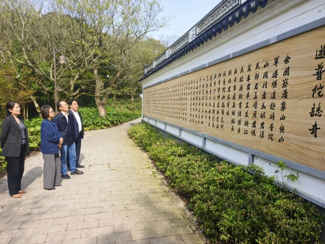 隨后,調(diào)研組一行來到瞻圣廣場。1916年,孫中山考察舟山軍港,曾游覽普陀山,留有《游普陀志奇》一文,文中描述他在游佛頂山時見到的“空碧濤白,煙螺數(shù)點,覺生平所經(jīng),無似此清勝者”奇異景象。自2006年以來,舟山民革接續(xù)前行、賡續(xù)奮斗,深入挖掘當?shù)鼐哂忻窀锾厣淖娼y(tǒng)資源,于2021年起,重立紀念石、新建照壁、修繕瞻圣亭,進一步展現(xiàn)孫中山先生與普陀山的歷史淵源。