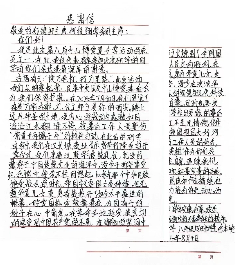 “你們好!來(lái)信我們收到了,看了以后很高興?!?月12日,全國(guó)人大常委會(huì)副委員長(zhǎng)、民革中央主席鄭建邦,全國(guó)政協(xié)副主席、民革中央常務(wù)副主席何報(bào)翔給第八屆中山博愛(ài)夏令營(yíng)全體營(yíng)員回信,給予他們親切勉勵(lì),并祝他們學(xué)業(yè)有成、家庭幸福,將來(lái)做對(duì)國(guó)家、對(duì)人民、對(duì)社會(huì)有用的人。