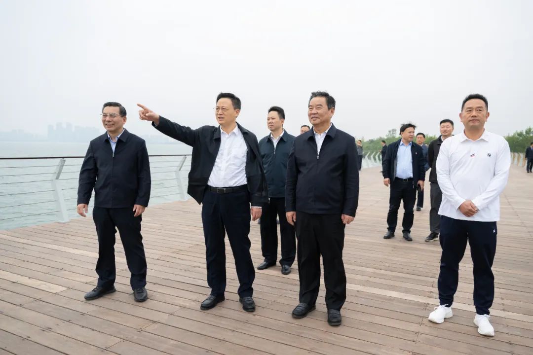 10月13日,何報翔一行在湖北襄陽魚梁洲中央生態(tài)公園考察水生態(tài)修復(fù)情況。