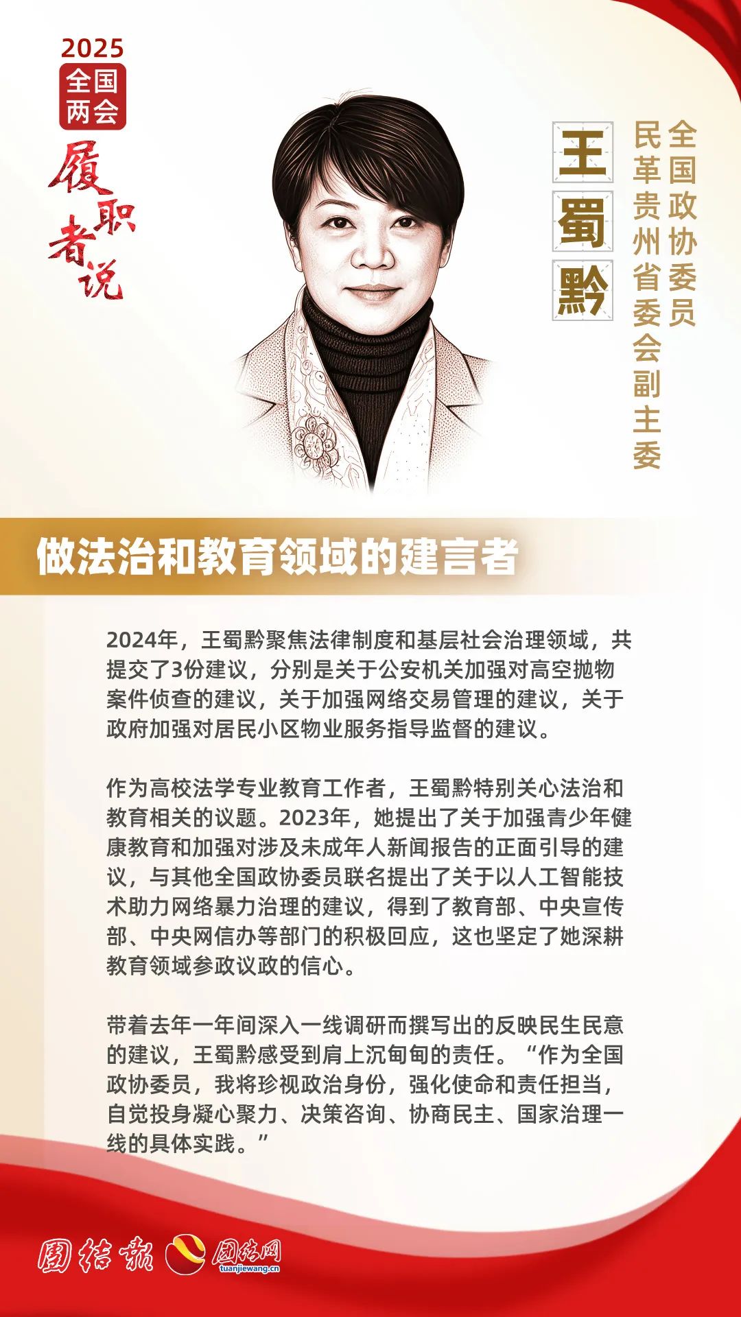 3月,北京人民大會堂穹頂上的五角星在澄澈的天幕下愈發(fā)鮮亮。正參加2025年全國兩會的全國政協(xié)委員、民革貴州省委會副主委、貴陽學院副校長王蜀黔回顧了過去一年的履職經(jīng)歷。