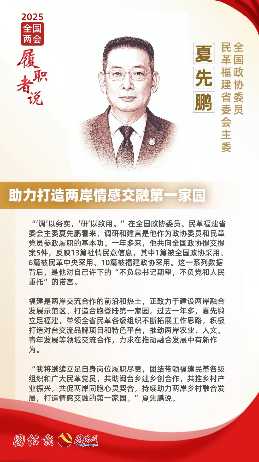 與此同時(shí),夏先鵬還指導(dǎo)民革福建省委會(huì)完成兩個(gè)涉臺(tái)課題,為政府決策提供有力參考;組織編印《2012-2024福建民革祖統(tǒng)工作圖錄》,系統(tǒng)展示福建民革推動(dòng)兩岸融合發(fā)展成效;組織承辦兩岸鄉(xiāng)村農(nóng)田水利建設(shè)交流會(huì),搭建兩岸水利專(zhuān)家和基層民眾交流合作平臺(tái)……去年10月,民革全國(guó)祖統(tǒng)工作會(huì)議在福州召開(kāi)時(shí),他作為先進(jìn)代表分享了有關(guān)做法和經(jīng)驗(yàn)。