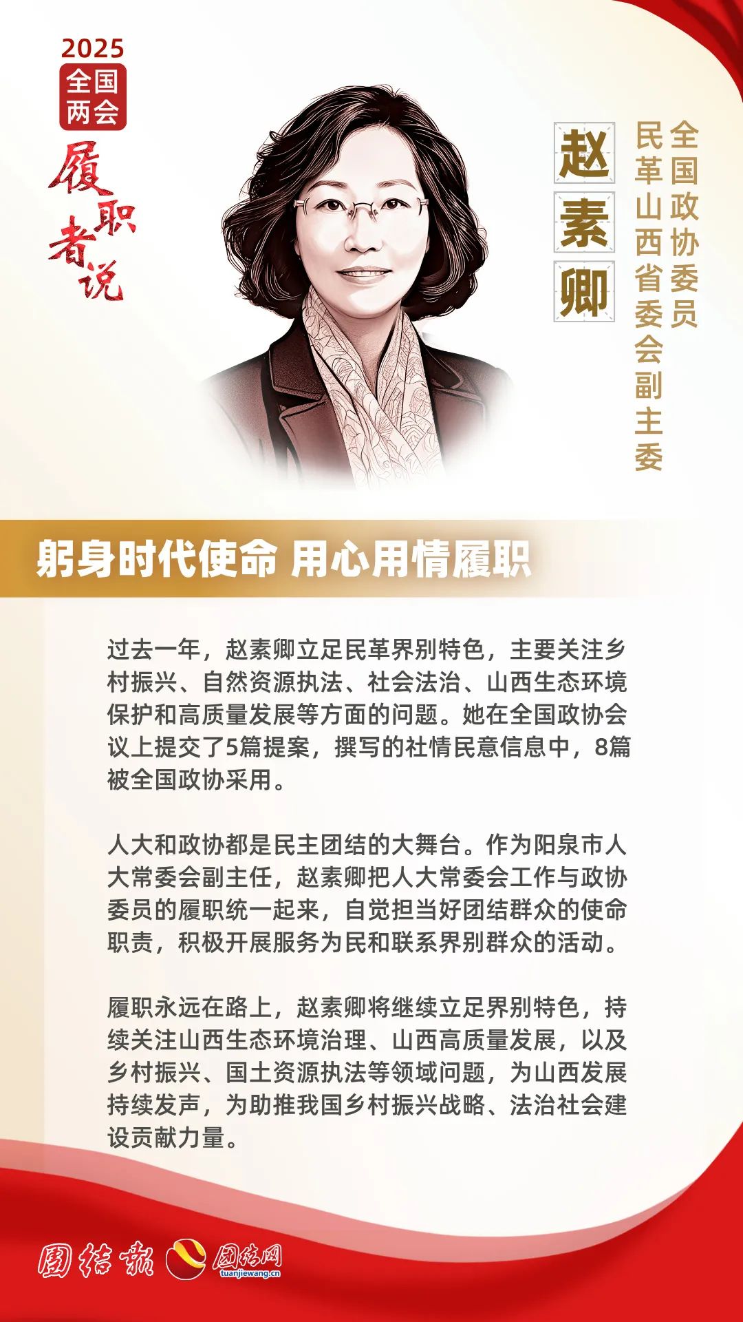 “政協(xié)委員就應當為國履職、為民盡責?!壁w素卿表示,她將繼續(xù)立足界別特色,持續(xù)關注山西生態(tài)環(huán)境治理、山西高質(zhì)量發(fā)展,以及鄉(xiāng)村振興、國土資源執(zhí)法等領域問題,為山西發(fā)展持續(xù)發(fā)聲,為助推我國鄉(xiāng)村振興戰(zhàn)略、法治社會建設貢獻力量。