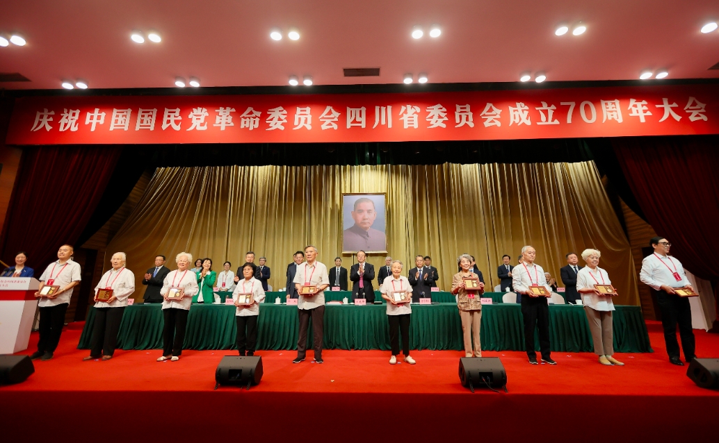 紀(jì)念大會上,鄭建邦為民革黨齡40年以上的老黨員及“光榮在黨70年”代表頒發(fā)紀(jì)念章,與會人員還共同觀看民革四川省委會成立70周年主題片。