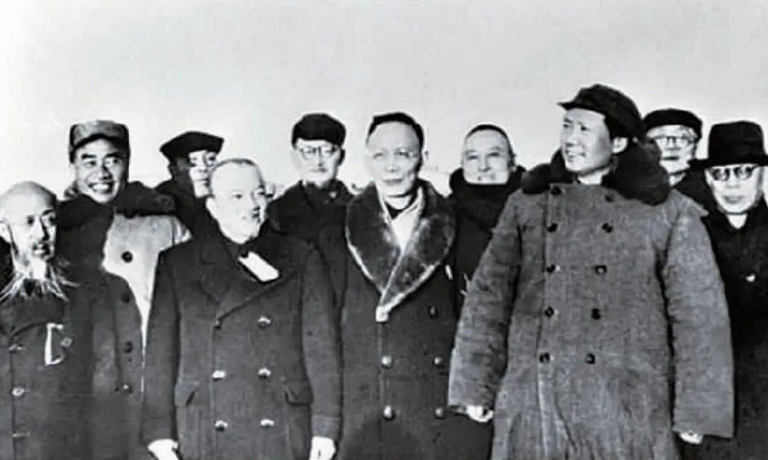 1949年3月25日,毛澤東等率中共中央機關和人民解放軍總部進入北平,同前來迎接的民主黨派負責人和其他民主人士在西苑機場合影。左四為李濟深。