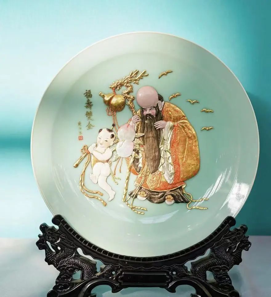 在打好基本功的同時,李明霽也在技藝傳承中不斷探索思考、改良創(chuàng)新?!秹凵霞訅邸肥撬顫M意的作品之一,現(xiàn)收錄于寧波北侖博物館。水綠淡雅的青瓷盤面上,拷貝出人物祝壽的圖樣并以漆泥堆砌出立體感,人物衣著處、邊緣處、主體處分別用浮花、平花、砂金工藝,覆上24k金箔后再描金上彩。“這是泥金彩漆與越窯青瓷的碰撞結(jié)合,效果出奇的好!”李明霽說道。