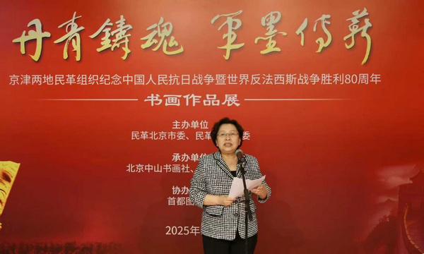 王紅在致辭中表示,民革北京市委會、民革天津市委會聯(lián)合舉辦此次書畫展,以敬畏之心回望那段血火交織的歲月,以傳承之志叩問歷史深處的回響,就是要銘記歷史、緬懷先烈,傳承和弘揚偉大抗戰(zhàn)精神,重溫中國人民全民族抗戰(zhàn)、愛國民主人士與中國共產黨共同為民族獨立而浴血奮斗的壯麗史詩,賡續(xù)傳承多黨合作的優(yōu)良傳統(tǒng),這是兩地民革組織深化交流的契機,也是共同提升履職能力的舉措。