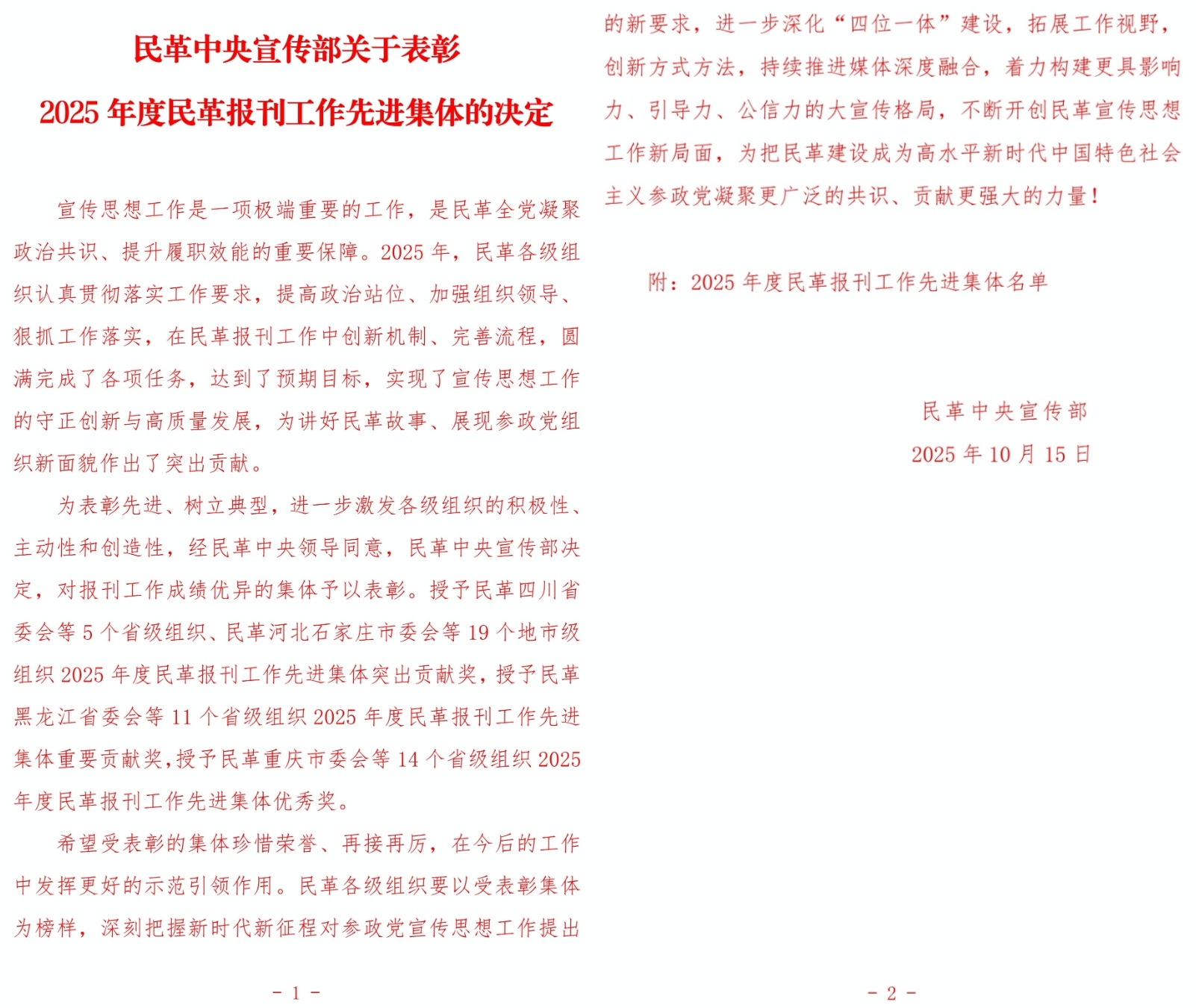 會(huì)議介紹了《團(tuán)結(jié)報(bào)》《團(tuán)結(jié)》雜志工作和報(bào)刊發(fā)行情況,宣讀了《民革中央宣傳部關(guān)于表彰2025年度民革報(bào)刊工作先進(jìn)集體的決定》。民革四川省委會(huì)、貴州省委會(huì)、吉林省直工委、青島市委會(huì)作了經(jīng)驗(yàn)交流發(fā)言。