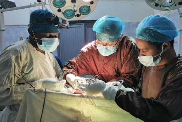 圖為強(qiáng)堯生(中)帶領(lǐng)受援醫(yī)院同事做手術(shù)。