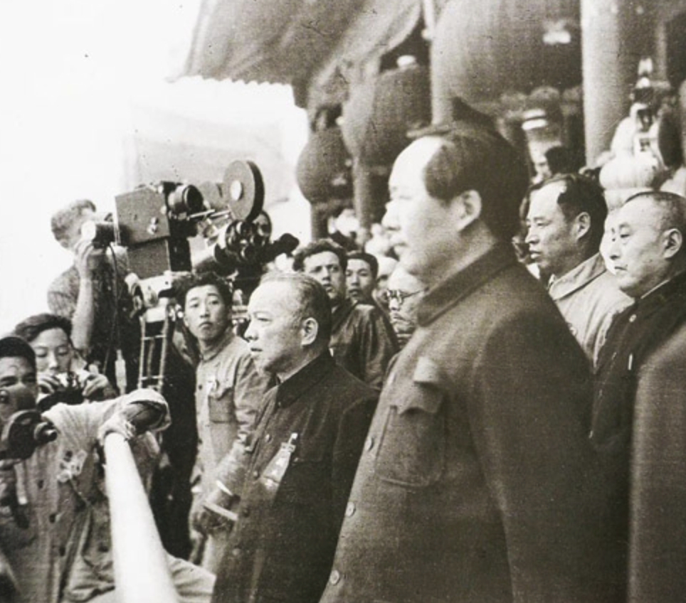1949年10月1日,毛澤東(前右一)、李濟(jì)深(前右二)等在天安門城樓上。