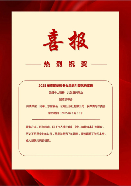 【山東】團(tuán)結(jié)報(bào)社表彰2025年度團(tuán)結(jié)讀書會(huì)優(yōu)秀案例 “‘弘揚(yáng)中山精神 共創(chuàng)復(fù)興偉業(yè)’團(tuán)結(jié)讀書會(huì)”獲思想引領(lǐng)優(yōu)秀案例